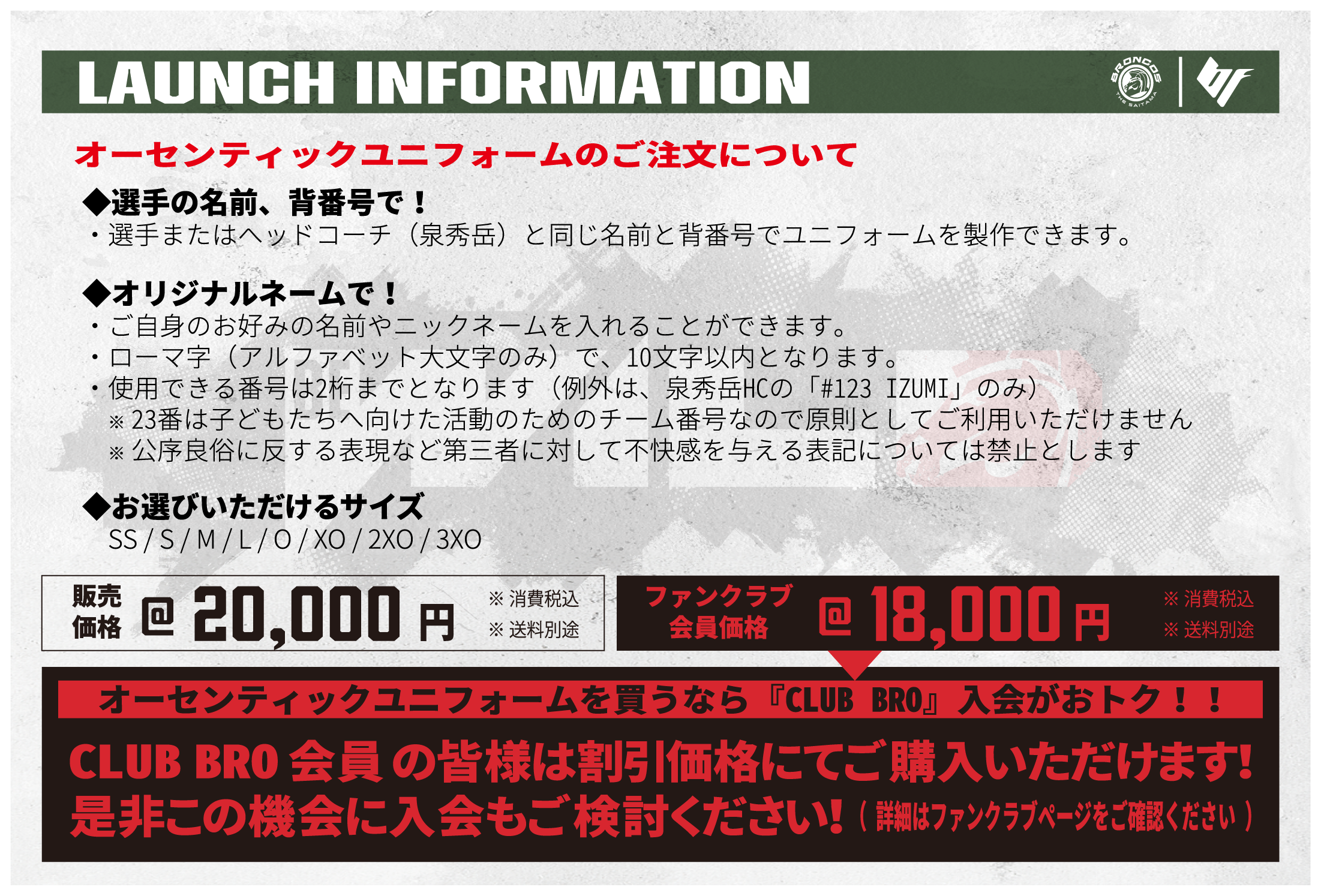 選手たちが試合時に着用する株式会社フラスコ100CC製のユニフォームと同じ生地・デザインのオーセンティックユニフォームの受注販売となります。