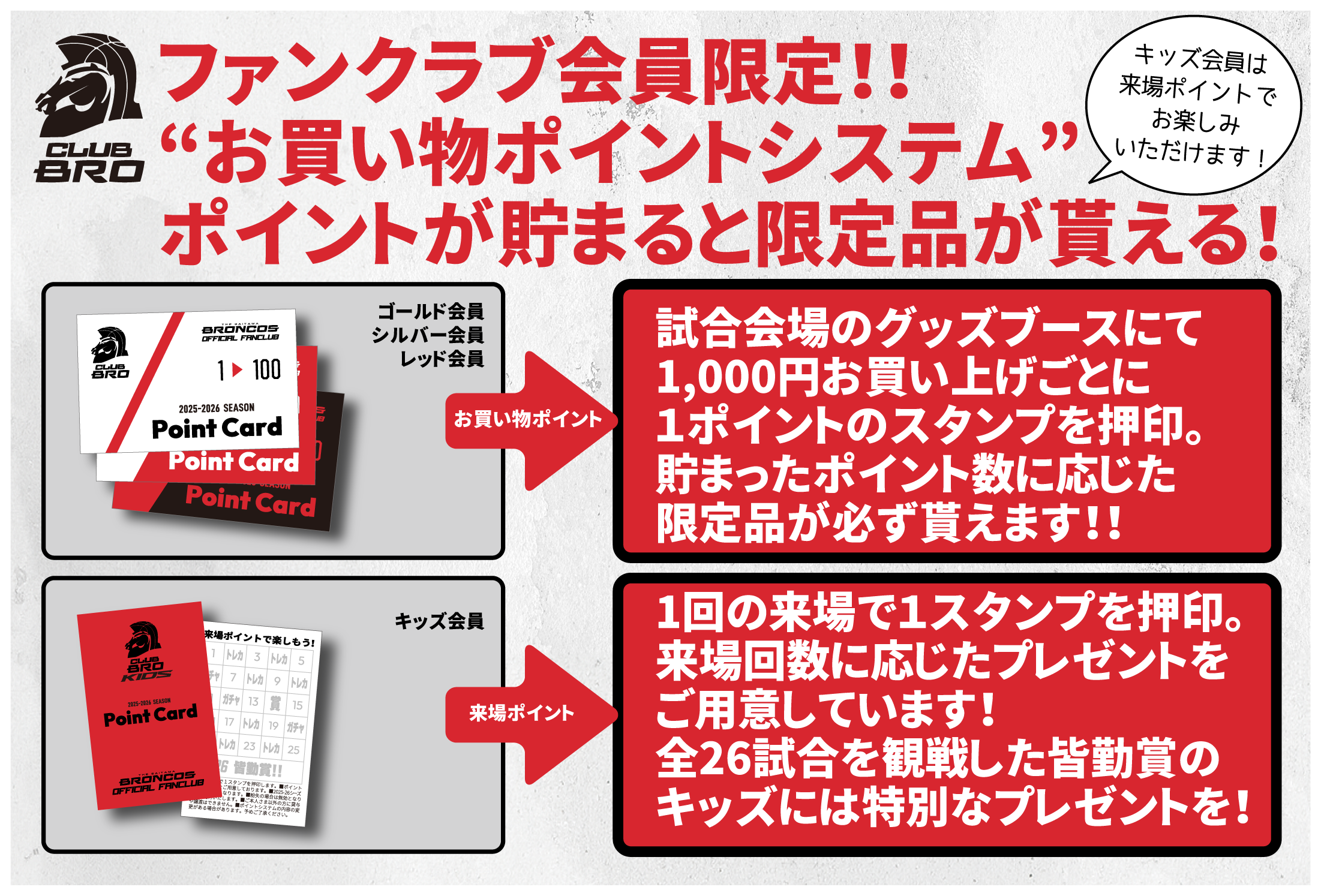 この度、さいたまブロンコスでは公式ファンクラブ「CLUB BRO」の皆様を対象としたグッズ購入ポイントシステムを導入致します。