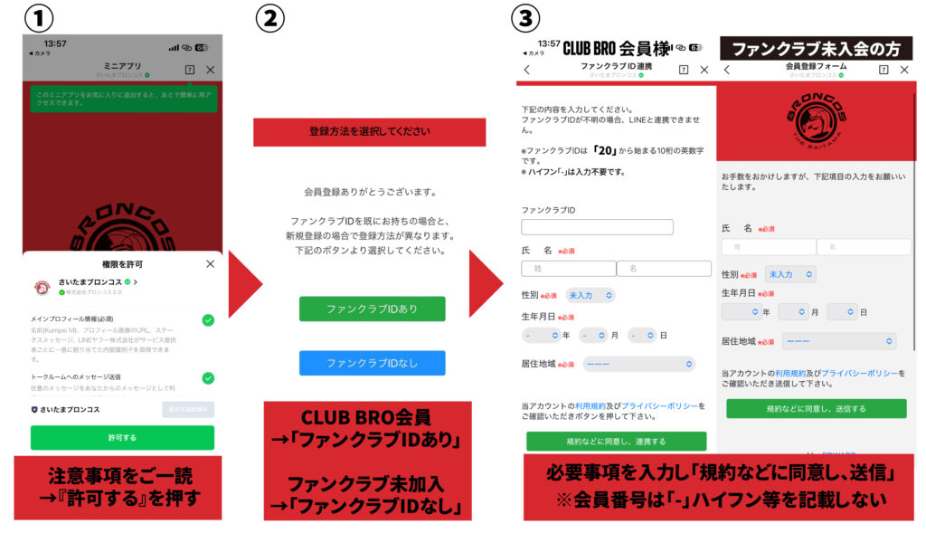 ファンクラブの会員IDなしで間違ってご登録されたメンバーさまは以下の①~③の内容をさいたまブロンコス公式LINEアカウント宛に以下のメッセージをお送りください