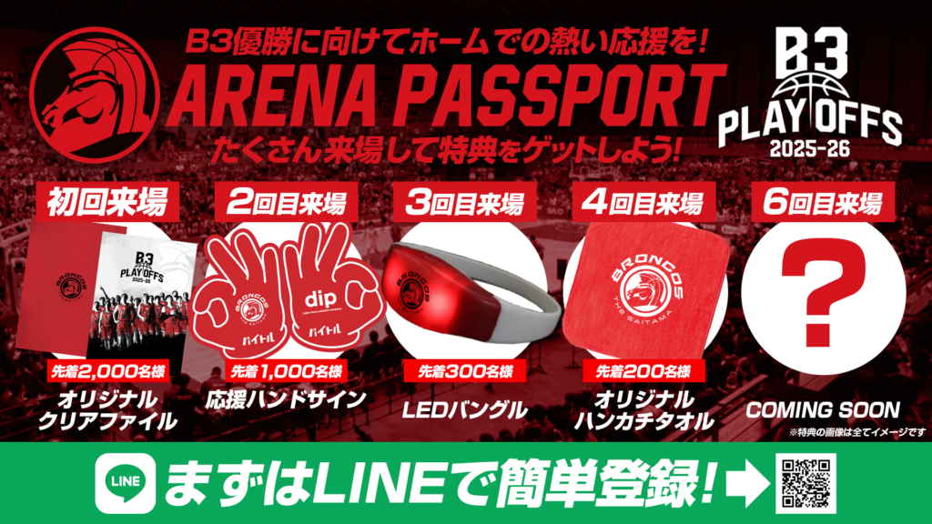 さいたまブロンコス公式LINEの友だち追加、およびデジタル会員証を設定(無料)の上、ホームゲーム会場で来場登録を行っていただくことで「来場スタンプ」を取得することができます。集めたスタンプ数に応じて来場特典をプレゼントいたします。