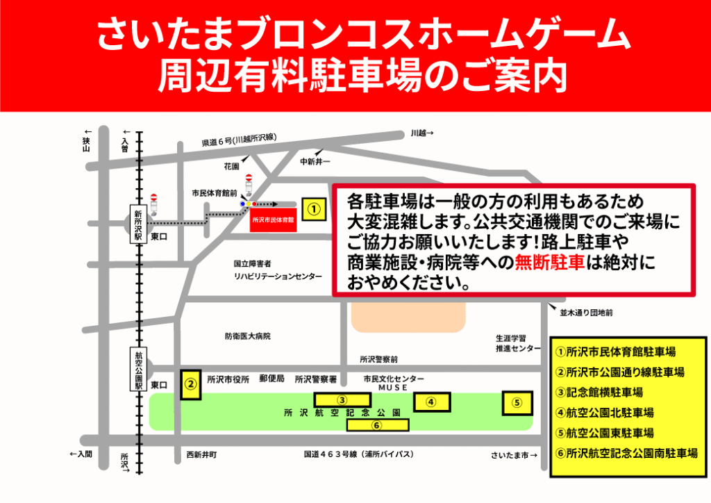 ②会場へご来場の際は公共交通機関をご利用いただきますようお願いいたします。臨時駐車場等のご用意はございません。所沢市民体育館の駐車場は一般有料駐車場となります。一般利用者の利用もあり大変混雑いたします。
