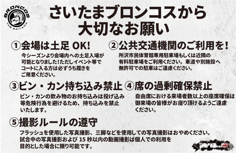 初めてアリーナに足を運んでいただく皆さまも、またこれまでもアリーナで観戦・応援を楽しんでいただいている皆さまも、素晴らしいアリーナ体験をお持ち帰りいただくために、すべての皆さまのご協力をお願いいたします。