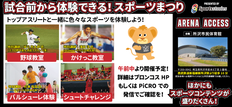 ②会場へご来場の際は公共交通機関をご利用いただきますようお願いいたします。臨時駐車場等のご用意はございません。所沢市民体育館の駐車場は一般有料駐車場となります。一般利用者の利用もあり大変混雑いたします。