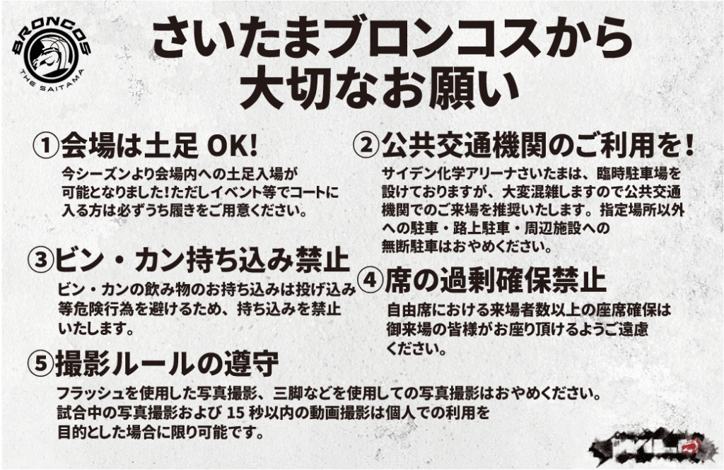 初めてアリーナに足を運んでいただく皆さまも、またこれまでもアリーナで観戦・応援を楽しんでいただいている皆さまも、素晴らしいアリーナ体験をお持ち帰りいただくために、すべての皆さまのご協力をお願いいたします。