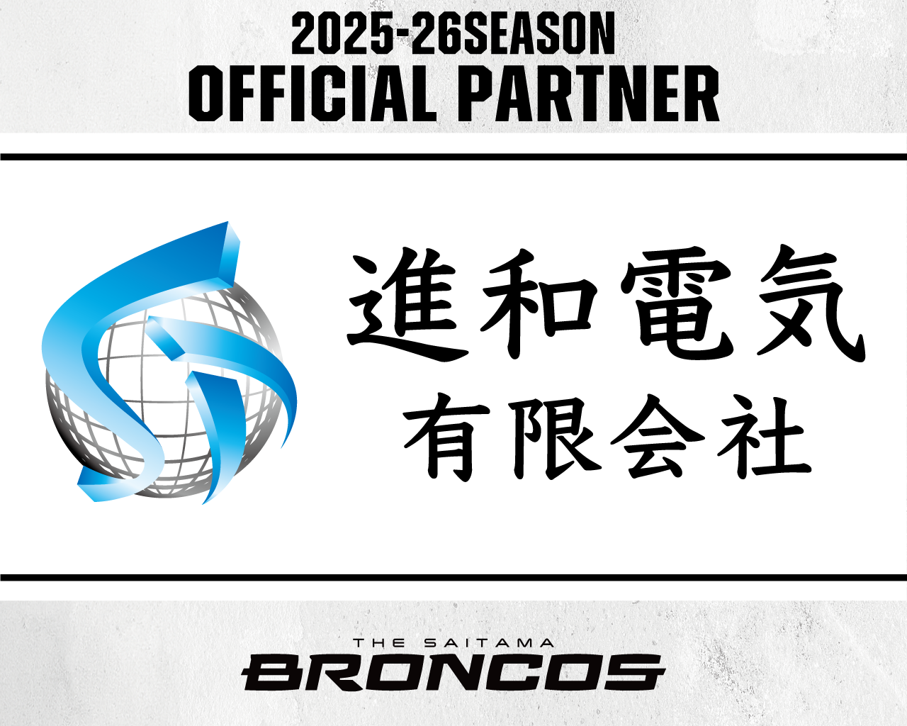 この度、さいたまブロンコスは、進和電気有限会社と2025-26シーズンより、オフィシャルパートナー契約を締結いたしましたのでお知らせいたします。