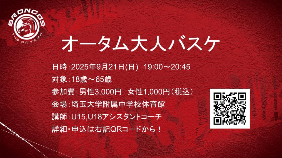 この度、さいたまブロンコスではオータム大人バスケを開催致します!
