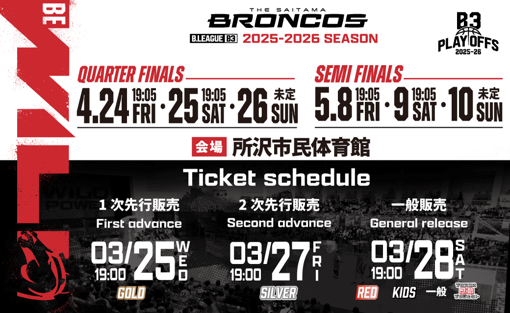 2025-26SEASON ホームゲームチケット発売日のお知らせ(B3 PLAYOFFS QUARTERFINALS・SEMIFINALS)